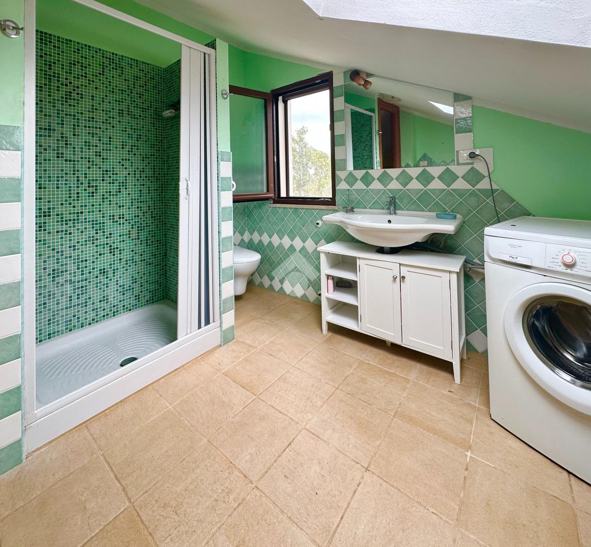 On the upper floor there are two two-room apartments, one with a double bedroom, living room with kitchenette, bathroom with window and shower, and terrace; the other apartment has a large living room with kitchenette, spacious bathroom with shower and window, and a double bedroom.